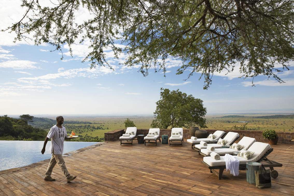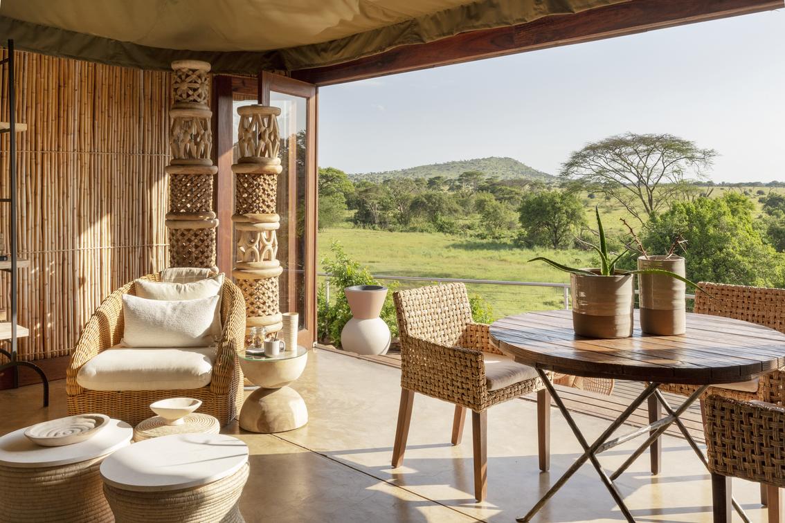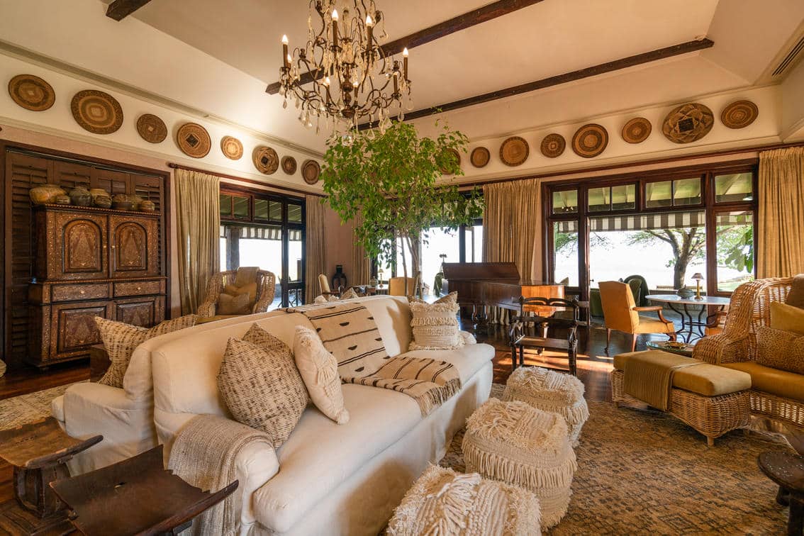 With unparalleled views of the endless grasslands from its elevated vantage point on Sasakwa Hill, the lodge epitomizes refined splendour and old-world luxury while celebrating a casual approach. Features include a grand entrance, wraparound verandas, silver candelabras, coveted antiques, and bespoke décor elements such as local artefacts and tribal cushions—all seamlessly contributing to a quintessential East African safari.