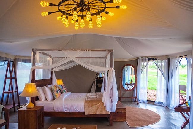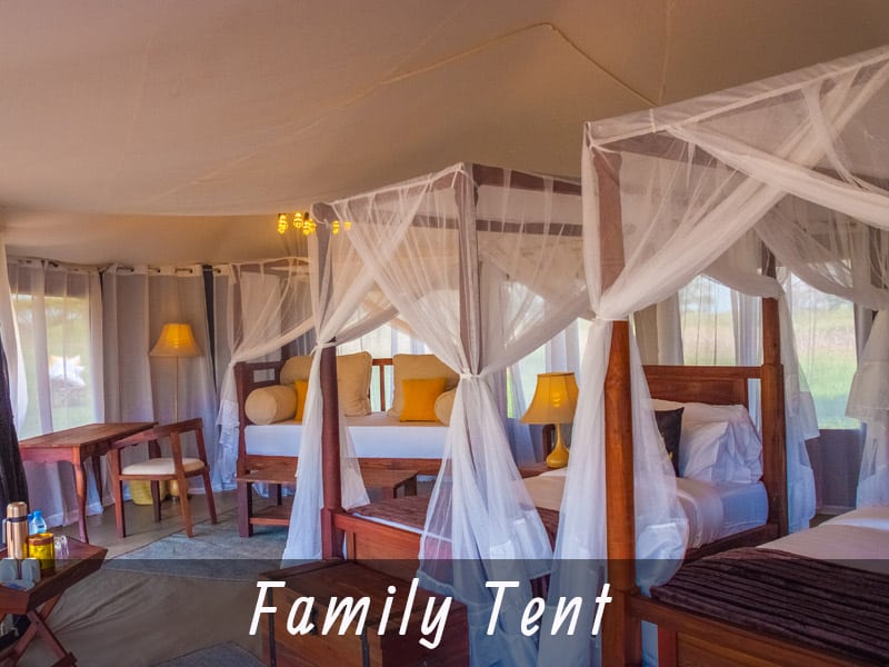 Our spacious tents exude a warm, colonial-style ambiance designed for ultimate relaxation. Each tent features a large rest area with a canopied sofa made of mninga wood, complemented by handcrafted furniture from local artisans.